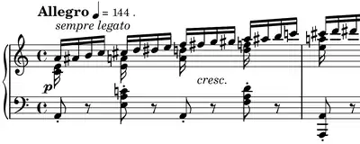 Étude Op. 10, No. 2, in A minor, is a technical study composed by Frédéric Chopin for the piano. It was preceded by a relative major key. Composed in November 1829,[1] it was first published in 1833 in France,[2] Germany,[3] and England.[4] This étude is an exercise in developing the independence of the weaker fingers of the right hand by playing rapid chromatic scale figures with the third, fourth, and fifth fingers of the right hand. Meanwhile, the first two fingers of the right and the left hand play an accompaniment of short intervals and single notes. Chopin indicated the fingering himself note by note for almost 800 notes.[5]