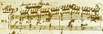 A copy by Józef Linowski of Chopin's autograph reads cut time (alla breve) for No. 2,[7] but this seems to have been overlooked. The original (first French, German, and English) editions have common time.[8] Chopin's metronome marking for the piece is quarter note = 144 referring to quarter notes. Later editors have followed Chopin in this regard with the exception of Hans von Bülow who suggests quarter note = 114.[9]