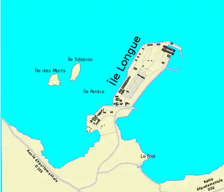Île Longue is a peninsula on the commune of Crozon, attached to the Crozon peninsula. its altitude is 42 metres and has an area of 1.10 km2. To the north of the peninsula there are two small islands: Ile des Morts and Ile Trébéron.