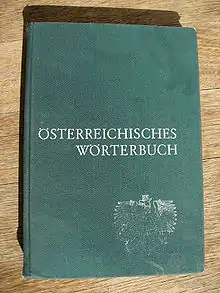 At that time, only six years after World War II, Austria was still under Allied administration and the Austrian civilian government tried to cut political ties to Germany, including cultural and linguistic reminiscences to the former Nazi regime.[1] The creation of the Austrian dictionary has to be assessed under these circumstances. The annexation of Austria into Greater Germany in 1938 had also brought a unified official standard form of the German language, that was now revised by referring to pre-war Austrian standards and by including local vocabulary originating from Austro-Bavarian dialects, especially but not exclusively typical Viennese terms.