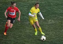 Özge Özel (left) playing for Konak Belediyespor in the away match of the 2014–15 season against Kireçburnu Spor.