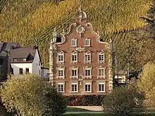 Ürzig is characterized by little lanes and nooks as well as patrician and timber-frame houses in the historical village centre. Knightly families once built three castles here, only one of which has been preserved, and that only as ruins. At the remnants of an old watchtower in the vineyards, a sundial has been installed. In Ürzig, there exist even today several wineries, which mainly grow Riesling. The best known vineyard is the Ürziger Würzgarten, although there is also the less well known Ürziger Goldwingert. The Baroque Mönchhof on the promenade served in the late 1980s as a backdrop in the television series Moselbrück.