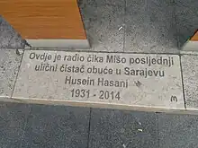 The day after his death, a petition calling for a memorial to be placed in the spot where he sat everyday was started on Facebook.[16][17][18][19] On 11 January 2014, the workers of the McDonald's fast food restaurant in front of the spot where he worked paid for and set up a commemorative plaque that reads: "Here worked čika Mišo, the last shoe-shiner in Sarajevo. Husein Hasani 1931–2014."[20]