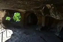 İnceğiz village is located about 9 km (5.6 mi) northwest of Çatalca.[1] The cave monastery is situated at Karasu Valley overlooking Karasu Creek. It is a four-story apartment building of rock-cut architecture. The structure was cut out in limestone formation, which has a suitable lithography for easy forming.[2] The site in the cliff is accessible by a wooden staircase on the trail. The openings of the cliff dwelling are barred by chains.[3]