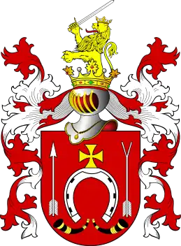 According to Długosz: red, a horseshoe argent, silver horseshoe pointing downwards, surmounted of a golden cross pattée; on the right, a silver arrow in a pale, on the left, an arrow with a pall pointing downwards; in the crest, a golden half-leaf in a crown with a sword in its right paw.[3]