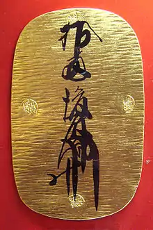 An Ōban (大判) was a monetary ovoid gold plate, and the largest denomination of Tokugawa coinage. Tokugawa coinage worked according to a triple monetary standard, using gold, silver and bronze coins, each with their own denominations.[1]