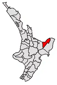 The Whakatane County Council established in 1876 included Ōpōtiki.[3] Opotiki became a Town District in 1882.[4] Opotiki County separated from Whakatane County in 1899 or 1900,[3][5] and Opotiki town became a borough in 1908 or 1911.[4][5] The borough and county merged in 1973.[5] In the 1989 local government reforms, some parts of the Opotiki district became part of Whakatane District again.[3]