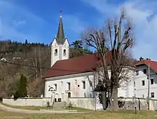 The church in Šentožbolt is dedicated to Saint Oswald. It is a single-nave structure with a polygonal chancel oriented toward the east, and it was first mentioned in written records in 1526. The church was remodeled in the Baroque style in 1621, and remodeled again in 1825. An old fresco is preserved on the exterior wall. The furnishings in the church are late Baroque.[4][5] The painting of Saint Bartholomew in the church is the work of Leopold Layer (1752–1828). The church was designated a vicariate in 1787 and the seat of a parish in 1876.[5]