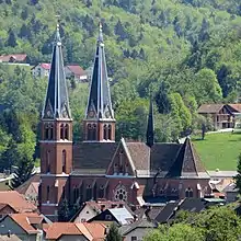 The center of the town is dominated by the neo-Gothic church dedicated to Saint Martin, from which the settlement gets its name (Šent Martin > Šmartno). It belongs to the Roman Catholic Archdiocese of Ljubljana. The church was designed by the architect Adolf Wagner, and was built between 1899 and 1901 on the site of an earlier church mentioned in written documents dating to 1363.[4] The interior of the church is illuminated by light coming through stained-glass windows designed by Anton Jebačin. According to a legend, the church was built on the place where trapped miners in Šmartno were once rescued on Martinmas.
