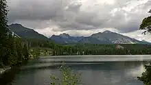 Štrbské Pleso (ⓘ, German: Tschirmer See; Hungarian: Csorbató or Csorba-tó; Polish: Szczyrbskie Jezioro) is a ski, tourist, and health resort in the High Tatras, Slovakia located on the lake by the same name. With extensive parking facilities and a stop on the Tatra trolley and rack railway, it is a starting point for a host of popular hikes including to Kriváň and Rysy.