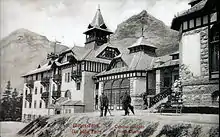 The future resort began to emerge in 1872 when Jozef Szentiványi ("of St. John". 1817–1906, from a noble family with roots in the nearby village of Liptovský Ján, originally: Sv. Ján, "St. John") built a hunting lodge on the banks of Štrbské pleso. Access to the High Tatras was made easier the year before when the railroad reached Poprad in their foothills. Szentiványi rented the lot from the village of Štrba whose municipal lands included the lake and which gave its name to it. He opened it to tourists a year later and allowed the Carpathian Union, a hiking society, to build its own Chalet Joseph nearby in 1875. The accommodation facilities that Szentiványi kept adding made it a popular destination.[2] The rack railway connecting it to the main railroad was built in 1896. The first ski school was organized in 1899.[3] The Tatra trolley linked it with other resorts on the Slovak side of the Tatras in 1912.[4] The resort was acquired by the government in 1901.
