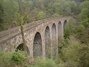 Žampach viaduct is a railway arch bridge in the territory of Jílové u Prahy in the Czech Republic near the village of Žampach. It is the highest stone bridge in the country. It is 41.73 m high, 109.3 m long, and formed by seven arches, each 12 m wide. It was constructed from 1898 to 1900 mainly by Italian workers.