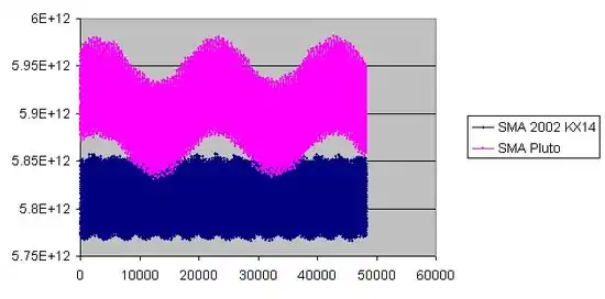The evolution of the semi-major axis of both Pluto (pink) and (119951) 2002 KX14 (blue).