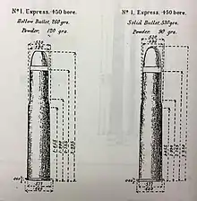 The .500/450 No. 1 Nitro for Black was the same cartridge loaded with mild loadings of cordite, carefully balanced to replicate the ballistics of the black powder version. Unlike other similar black powder cartridges, such as the .450 Black Powder Express and .500/450 Magnum Black Powder Express, the .500/450 No. 1 Express never became a Nitro Express cartridge.[2]