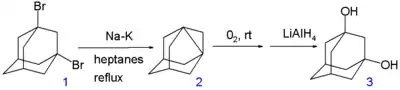 1,3-Dehydroadamantane was obtained in 1969 by Richard Pincock and Edward Torupka,[1] by reduction of 1,3-dibromoadamantane according to the scheme below: