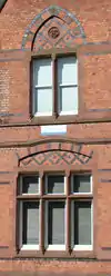 1–3 Churchyard Side is two-storey Victorian Gothic building in red brick with blue brick decoration and sandstone dressings, under a tiled roof.[1][2] The central main entrance is flanked by two gables and is reached by a flight of brick steps.[1] The left gable has an oriel window to the first floor, with the coats of arms of both Manchester and Liverpool beneath.[1][3] Several of the windows have stone mullions and transoms; some have decorative arches above in brick or brick and sandstone.