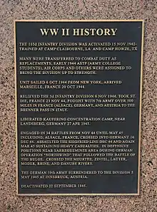 Plaque listing the units comprising the US 103rd Infantry Division in WW II.