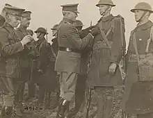 On October 1, 1917, nearly six months after the American entry into World War I, as New York National Guardsmen trained at Camp Wadsworth, South Carolina, the 108th Infantry Regiment was formed pursuant to a general order. By the same order, 1,350 men were transferred in from the 74th New York Infantry (Buffalo) and 293 men from the 12th New York Infantry (New York City).[5] In November 1917 the regiment was organized into the 54th Infantry Brigade as part of the 27th Division, commanded by Major General John F. O'Ryan. By 31 May 1918 the whole regiment had arrived in France. The 27th Division (minus the division's artillery) was attached to British forces for training and issued British rifles and machine guns. The Division ended up fighting alongside the British and Australians for its entire combat service. The Regimental Scout Officer of the 108th noted that "we were supposed to leave behind the customs and traditions of the U.S. Army, in which we had been so carefully brought up, in order that we might study and adapt ourselves to those of our Allies, the British, with whom our lot had been cast for the duration of the war."[6] This included living on the British Tommy's relatively scanty rations.[6]