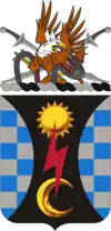 Description A Silver color metal and enamel device 1 1/8 inches (2.86 cm) in height overall consisting of a shield blazoned: Sable, between two flaunches checky Argent (Silver Gray) and Azure (Oriental Blue) a sun in splendor in chief and in base a decrescent Or, overall palewise a lightning flash Gules. Attached below the shield a Silver scroll inscribed "SEEK AND DISRUPT" in Black letters.