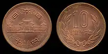 The first ten yen coins made after World War II were authorized by law on March 2, 1950, by prime minister Shigeru Yoshida. These coins were to be made of German Silver, and act as "temporary subsidiary coins".[23] A total of 432,970,000 ten yen coins minted in this new alloy were recorded as struck by the end of that year. By the end of 1951 almost 800 million of these coins had been minted and were waiting to be distributed.[24][25] None of the German silver coins minted between 1950 and 1951 ever circulated as the coins were eventually melted. The decision to melt the coins came as the Korean War had driven nickel prices to about 4.1 million yen per ton.[26][27] Those that escaped being melted and are now considered by collectors to be "scarce" Japanese pattern coins.[28][29] Bronze ten yen coins were first minted in 1951, but were not released for general circulation until January 4, 1953.[30] Ten yen coins minted between 1950 and 1958 have reeded edges and are nicknamed Giza 10 (Giza Ju, ギザ10), meaning “jagged 10 yen coin” in Japanese.[31] The design which is used today features Phoenix Hall of Byōdō-in on the obverse, and Bay laurel leaves on the reverse. The design remains essentially the same other than the reeds being dropped in 1959 which gave the coins a smooth edge. Slight modifications were also made in the latter half of 1986 regarding the design of Byōdō-in.[31] These coins are not culturally recommended as shrine offerings as another word for "10" is "toh" (十), and another word for "yen" is "en" (円). Combining these characters into "toh-en" can also read as "far destiny" (遠縁).[32] Ten yen coins continue to be produced up to the present under the Reiwa era.