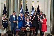 Despite Democrats holding thin majorities in both chambers during a period of intense political polarization, the 117th Congress oversaw the passage of numerous significant bills,[3][4] including the Inflation Reduction Act, American Rescue Plan, Infrastructure Investment and Jobs Act, Postal Service Reform Act, Bipartisan Safer Communities Act, CHIPS and Science Act, Honoring Our PACT Act, Electoral Count Reform and Presidential Transition Improvement Act, and Respect for Marriage Act.[4]