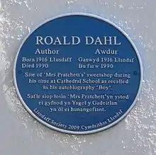 It had not been clear where 'Mrs Pratchett's sweet shop was located. The Llandaff Society had thought it could have been 11 High Street, 38 Bridge Street, 2 High Street, a site on Cardiff Road, 48 High Street, or the HSBC bank on Cardiff Road where Dahl spent his pocket money on sweets.[1] It took a visit from Lissy, Dahl's second wife, to determine the exact location of the sweet shop.[5] The blue plaque was the first publicly-viewable commemorative plaque to recognise Dahl's life in Llandaff.[5]