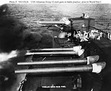 ![]() USS Arkansas (BB-33) firing her 12"/50 guns in battle practice prior to World War I | |