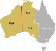 In Australia, the meridian nominally defines the eastern border of Western Australia, and the western borders of the Northern Territory and South Australia.[1] However, the border of Western Australia actually meets the Northern Territory border and South Australian border at the 26th parallel south, at what is known as Surveyor Generals Corner.[2]