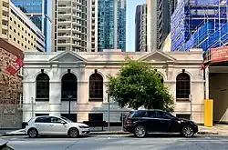 A single level brick building has a stone basement half exposed at footpath level. Its facade has been rendered and painted a cream colour. The facade is divided into two nearly identical symmetrical portions each with three major arched openings. The middle opening of each portion is slightly wider than the other openings and above them are triangular pediments at parapet level supported on moulded brackets. The facade treatment to the plinth is rendered and coursed to resemble ashlar. A string course runs across between the openings at the springing level of the arches. The semi-circular arches have moulded surrounds and keystones. A dentilled cornice line runs below the parapet in line with the base of the triangular pediments. The original entry is in the centre of the eastern bay and two new entries have been placed in the facade to match the original opening. Laneways run down both sides of the building and there are a series of square headed openings down each side to take advantage of natural light. At the rear a plain brick L-shape building forms a courtyard with the back of the front building. This would seem to be a later addition (before 1913) having shallow broad arched brick openings. The connecting narrow part of the building has a loading bay at first floor level.[1]