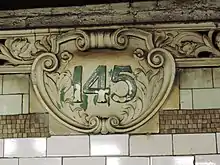 - ↑ Cox, Jeremiah (June 24, 2008). "A close up of a terra cotta cartouche at 145 Street it is identical with other then the numbers in it to similar cartouches at all the other Lenox Avenue stations except 110 Street". subwaynut.com. Archived from the original on March 9, 2016. Retrieved November 28, 2018.