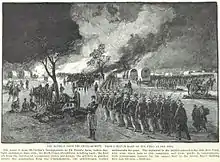The regiment was in action at West Point, and at Gaines Mill, its loss being over 200 killed and wounded. Their straw hats stood out on the battlefield, making them targets for Confederate guns.[1] The regiment was present through the remainder of that week of battle, but was not closely engaged, then encamped at Harrison's Landing until August 16, 1862, when it returned for a brief period to Alexandria. In the Battle of Crampton's Gap it was in the van and lost heavily and was held in reserve at Antietam; at Fredericksburg was posted on picket duty, and after the battle went into winter quarters near Falmouth. It shared the hardships and discomforts of the Mud March under Burnside and was active in the Battle of Chancellorsville, with a loss at Salem Church of 20 killed, 87 wounded and 49 missing. A few days were next spent at Banks' Ford, then a short time in the old camp at Falmouth, and on May 22, 1863, the regiment was mustered out at Albany. During its term of service, its loss was 112 men killed or mortally wounded and 84 deaths from other causes. The three years men were transferred to the 121st New York.