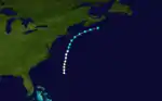The bark St. Ursula observed a hurricane about 375 mi (600 km) east-northeast of Dominica of July 28.[2] Tracking generally northwestward, the storm changed little in intensity until located to the north of Grand Turk. From there, it proceeded northwestward, and intensified to near Category 1 hurricane status. As it moved to the southwest of Wilmington, North Carolina, the storm attained its peak intensity of 105 mph (165 km/h) and a minimum barometric pressure of 969 mbar (28.6 inHg),[5] based on observations from a ship located about 140 mi (230 km) east of Norfolk, Virginia.[2] Shortly thereafter, the cyclone commenced re-curving to the northeast and began a weakening trend, falling to Category 1 strength by early on August 2. Further weakening occurred while the hurricane was located to the west of Sable Island. The storm was last reported to the south of Cape Race on the island of Newfoundland on August 3.[5]