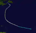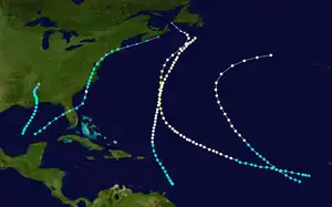 On September 9, a tropical storm was observed east of the Lesser Antilles. Over the following two days, it moved slowly north-northwestward through the islands, before reaching hurricane status on September 12. It turned more toward the north, and passed east of Bermuda on September 15. It was last observed on September 19.[4]