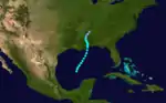 The Atlantic hurricane database begins the track for this system as a tropical storm about 140 mi (230 km) north of the Yucatán Peninsula early on October 22. Intensifying slightly as it moved northeastward across the Gulf of Mexico, the storm reached winds of 60 mph (95 km/h) prior to making landfall near Clearwater, Florida, around 08:00 UTC on October 23. About 10 hours later, the cyclone emerged into the Atlantic just north of Cape Canaveral and then curved north-northeastward. After briefly reaching hurricane intensity on October 24, the system made landfall near Topsail Beach, North Carolina, early on October 25 with winds of 60 mph (95 km/h). The storm then moved north-northeastward to northeastward across the Northeastern United States before emerging into the Gulf of Maine on October 27 and becoming extratropical. The extratropical system then dissipated just offshore Nova Scotia on the following day.[5]