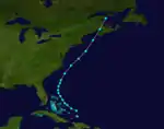 A Category 1 hurricane was first discovered on September 16 in the mid-North Atlantic. It moved generally to the northwest for a few days then passed safely to the northeast of Bermuda between September 18 and 19th. It weakened to a tropical storm as it was moving toward Atlantic Canada. It dissipated while just offshore of southern Newfoundland.[2] The storm is known to have reached hurricane strength from ship reports, most notably from the Harley John, and wind reports from St. Paul Island, Canada[4]