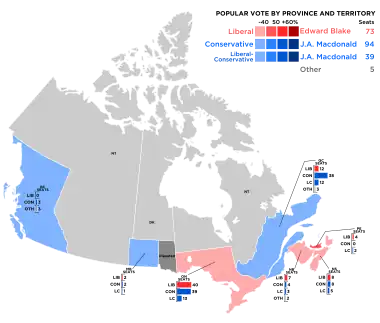 Prime Minister Sir John A. Macdonald's Conservatives and Liberal-Conservatives retained power, defeating the Liberal Party of Edward Blake.