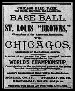 The two teams agreed to meet each other in a best-of-seven pre-modern-era World Series, with the winner taking all the prize money.[3][4] It was the second straight year that the Browns and White Stockings met in the World Series.[5] The six games of the series were played on six consecutive days.[6] The first three games were scheduled for Chicago, with the next three games to be held in St. Louis.[2] A decisive seventh game, if necessary, was to be held in a neutral site.[2] The location of the rubber game in the match was to be determined by coin toss, with each franchise owner selecting a city for the game.[7]