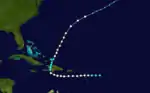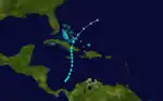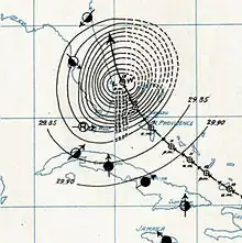 Weather maps indicated a tropical storm just east of the Lesser Antilles beginning on August 29.[9] The storm moved westward and strengthened into a hurricane early on August 30. Several hours later, it entered the Caribbean Sea after passing near Antigua and Montserrat.[2] Impact was generally light in the Lesser Antilles. At San Juan, Puerto Rico, sustained winds reached 48 mph (77 km/h).[9] The storm maintained winds of 80 mph (130 km/h) as it continued westward across the Caribbean Sea.[2] Vessels sailing from ports in Cuba and Hispaniola were advised to "take every precaution". After the storm curved northward late on September 1, vessels from Hispaniola only were advised to take caution.[9]