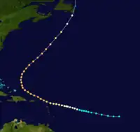 HURDAT initially indicates a tropical storm about 920 miles (1,480 km) west-southwest of Brava, Cape Verde on September 3. The storm moved west-northwestward and slowly intensified, reaching hurricane status late on September 5. It continued to slowly strengthen, becoming a Category 2 hurricane on September 6. About 24 hours later, the cyclone deepened into a Category 3 hurricane while located near the Lesser Antilles.[2] On Saint Kitts, sustained winds reached 62 mph (100 km/h), while up to 3.13 inches (80 mm) of rainfall was reported. Many houses were destroyed on Anguilla and Barbuda. In the former, an estimated 200 homes were demolished, leaving 800 people homeless.[10] Early on September 9, the storm reached maximum sustained winds of 120 mph (190 km/h). The storm maintained intensity as a Category 3 hurricane and re-curved northward by September 11.[2]