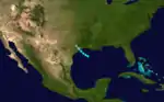 A hurricane was first observed south of Dominican Republic on July 28. Shortly thereafter, it made landfall in Azua Province with an intensity equivalent to a Category 1 hurricane. Early on July 29, the system weakened to a tropical storm, shortly before emerging into the southwestern Atlantic Ocean. It then moved west-northwestward and remained at relatively the same intensity over the next 24 hours. The storm made landfall near Islamorada, Florida on July 30. Crossing the Florida Keys, it soon emerged into the Gulf of Mexico. The storm began to re-intensify on July 31 and became a hurricane later that day. Early on August 1, it peaked with winds of 100 mph (160 km/h), several hours before making landfall near Apalachicola, Florida at the same intensity. The storm quickly weakened inland and dissipated over southern Alabama on August 2.[2]