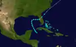 A ship observed a tropical storm north of Panama on November 7. The storm strengthened and headed northeastward across the central Caribbean Sea. It curved northward on November 8, around the time of peaking with winds of 65 mph (105 km/h). Later that day, the storm made landfall in Saint Thomas Parish, Jamaica at the same intensity. Thereafter, the system weakened and struck extreme western Santiago de Cuba Province, Cuba with winds of 50 mph (80 km/h) on November 9. It continued to weaken while crossing the island and emerged into the southwestern Atlantic Ocean later that day. The storm curved northeastward and passed through the Bahamas on November 10. It then weakened to a tropical depression, several hours before dissipating about 385 miles (620 km) southeast of Bermuda.[2]