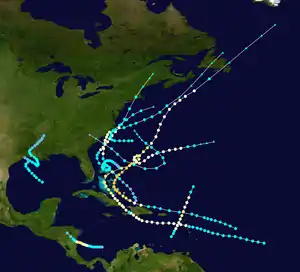 The season had a total of 10 tropical storms, 6 of which intensified into a hurricane.[1] Re-analysis by José F. Partagás and Henry F. Diaz in 1997 resulted in the addition of the second system,[5] while Christopher Landsea et al. added the sixth system in 2004 as part of the Atlantic hurricane reanalysis project.[4] Seven out of the ten systems reaching at least tropical storm intensity made landfall during the season.[1] Collectively, the tropical cyclones of the 1908 Atlantic hurricane season caused at least 37 fatalities.[6]