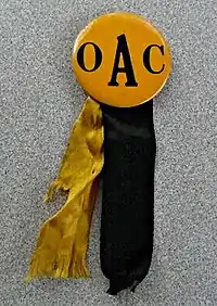 Pinback and ribbon in school colors produced for OAC football fans by a Corvallis department store.
