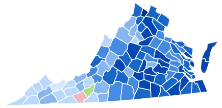Ultimately Wilson won Virginia by 48.96 percentage points over Taft, with Roosevelt a close third. Wilson carried all but two counties, and won the largest popular-vote victory in Virginia since Andrew Jackson in 1832 — although Franklin D. Roosevelt would three times exceed his popular vote percentage. Wilson ultimately won the national election with 41.84 percent of the vote. As of the 2020 presidential election, this is the last election in which Floyd County did not vote for the Republican candidate.[7]