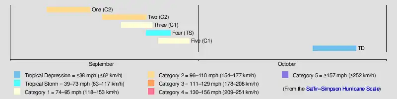 Of the season's six tropical cyclones, five became tropical storms and four strengthened into hurricanes. Furthermore, none of these strengthened into a major hurricane—Category 3 or higher on the modern-day Saffir–Simpson hurricane wind scale—marking the seventh such occurrence since 1900.[2] The strongest hurricane of the season peaked as only as a strong Category 2 with winds of 110 mph (175  km/h). The second hurricane caused one death and $1.45 million (1920 USD) in damage in Louisiana, the third left one fatality in North Carolina, and the fifth storm indirectly killed one person in Florida.