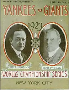 The 1923 World Series was the championship series in Major League Baseball for the 1923 season. The 20th edition of the World Series, it matched the American League champion New York Yankees against the National League champion New York Giants. The Yankees beat the Giants in six games. This would be the first of the Yankees' 27 World Series championships (as of 2024). The series was not played in a 2–3–2 format: as with the previous two Series (where both clubs had shared the Polo Grounds) the home field alternated each game, though this time it involved switching ballparks, as the first Yankee Stadium had opened this season.