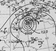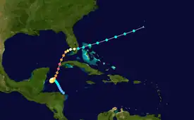 Late on October 13, a minimal tropical storm formed in the western Caribbean Sea east-northeast of northern Honduras.[4] The storm moved slowly west-northwest and gradually turned north on October 15. Later that day, it steadily intensified, attaining hurricane intensity on October 17. It strengthened to the equivalent of a major hurricane on October 19. The storm then struck the Pinar del Río Province of Cuba with sustained winds of 165 mph (266 km/h). On October 20, the hurricane turned east-northeast in response to the southward movement of a ridge.[3] It quickly weakened and made landfall in Southwest Florida near Naples, Florida as a Category 1 hurricane.[19] The storm entered the Atlantic Ocean north of Miami with 70 mph (110 km/h) winds. The cyclone steadily weakened as it moved across the western Atlantic Ocean, before dissipating west-southwest of Bermuda on October 23.[4] Following reanalysis released in March 2009, the storm was re-classified as a Category 5 with winds of 165 mph (266 km/h) and a minimum pressure of 910 mbar (27 inHg).[20]