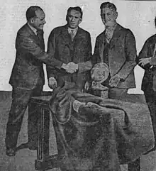 Tim Lowry (right) receiving the 1925 Chicago Tribune Silver Football. At the left is Coach Glenn Thistlethwaite and at the center is Athletics Director Kenneth L. Wilson
