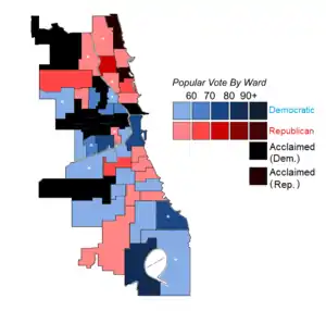 ![]() Results by ward. The map shows the winning candidate's party affiliations even though aldermen ran as nonpartisans. A white asterisk (*) means the results for that ward were decided in a runoff vote. | ||||||||||