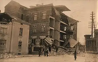 Both earthquakes achieved a maximum intensity of IX–X on the Medvedev–Sponheuer–Karnik scale and X–XI on the Mercalli intensity scale, causing major damage to the surrounding towns and villages.[3] At least 74,570 buildings were obliterated while another 21,000 left partially destroyed in 240 towns and villages.[7] Nearly every building in Chirpan and Parvomay collapsed as a result of the two earthquakes. The extreme shaking also bent and snapped railway tracks.[8] Over 264,000 residents in the affected area became homeless when their homes were damaged. Many of the survivors slept outside their homes for fear that more aftershocks would collapse them. Plovdiv which was severely affected by the earthquake suffered further destruction when the second mainshock struck closer to the city.